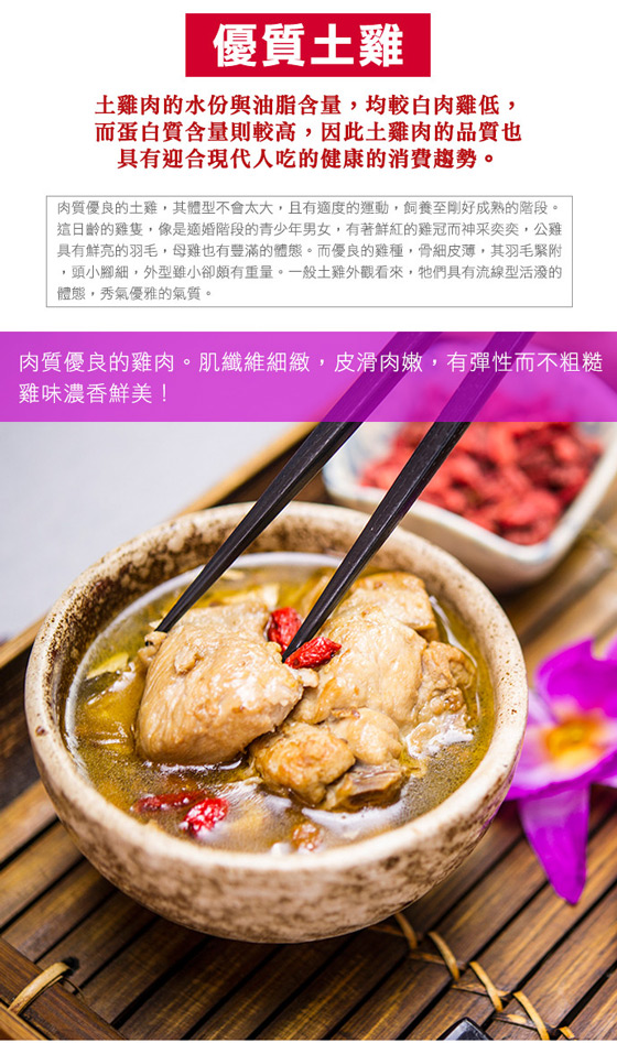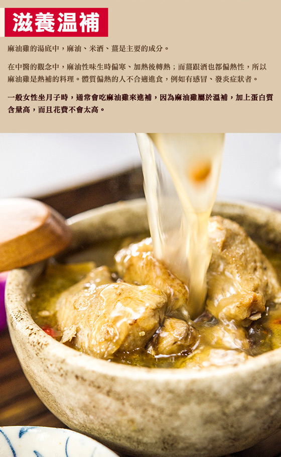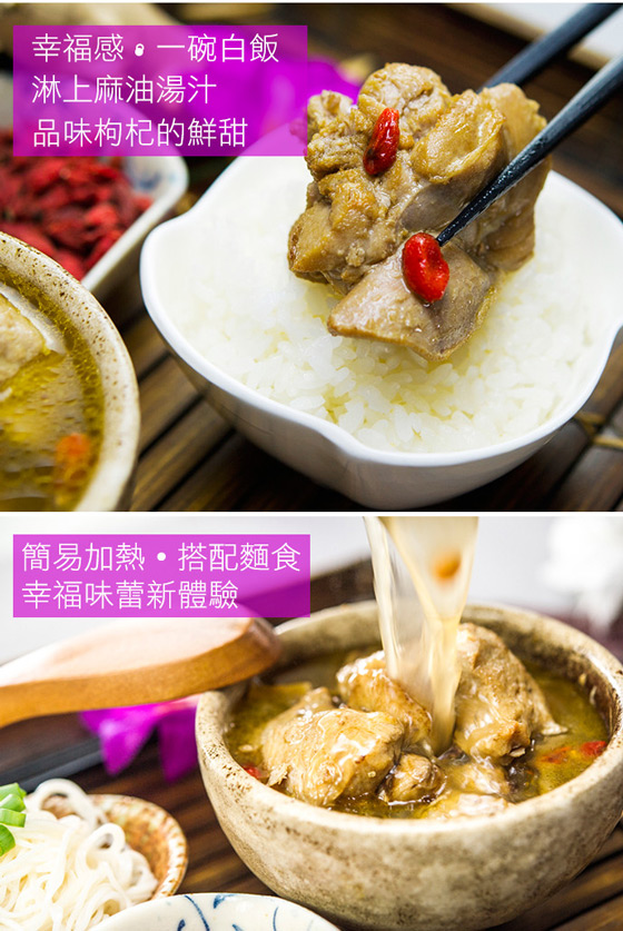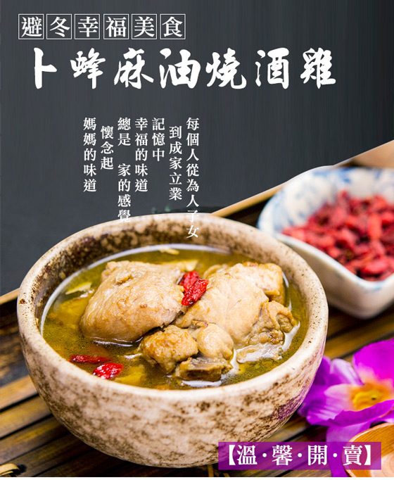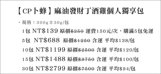 | CP卜蜂-麻油發財丁酒雞個人獨享包-冬季、女性滋補佳品,嚴選優質土雞精燉,肉嫩彈牙、湯頭濃郁,簡易加熱甘醇麻油雞即刻上桌!平均每包最低只要94元起(5包免運)即可享有【CP卜蜂】麻油發財丁酒雞個人獨享 售價:94 我要購買 |
