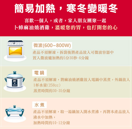 冬季養生滋補佳品,簡易加熱,好菜即刻上桌。 ![]() ![]() ![]() 商品規格 名稱:CP卜蜂麻油發財丁酒雞 成分:雞肉,薑,麻油,棕櫚油,米酒,枸杞,糖,樹薯澱粉,雞肉萃取物,鹽,糊精,乳糖,酵母萃取物 食品添加物:胺基乙酸,DL-胺基丙酸,5'-次黃嘌呤核苷磷酸二鈉,5'-鳥嘌呤核苷磷酸二鈉,琥珀酸二鈉,檸檬酸鈉 過敏原資訊:本產品含有堅果種子類,大豆,牛奶成分,對食物可能過敏的消費者,請仔細閱讀成分說明 保存條件:冷凍-18℃以下 保存期限:一年 淨重:300g±30g/包 產地:台灣 有效日期:標示於袋上(西元/年/月/日) 非供即食,應充分加熱 營養標示: ![]() ※為保持產品最佳風味,開封後請盡速食用完畢。 ※因製作/包裝過程繁複,實品規格可能會有些許誤差 |